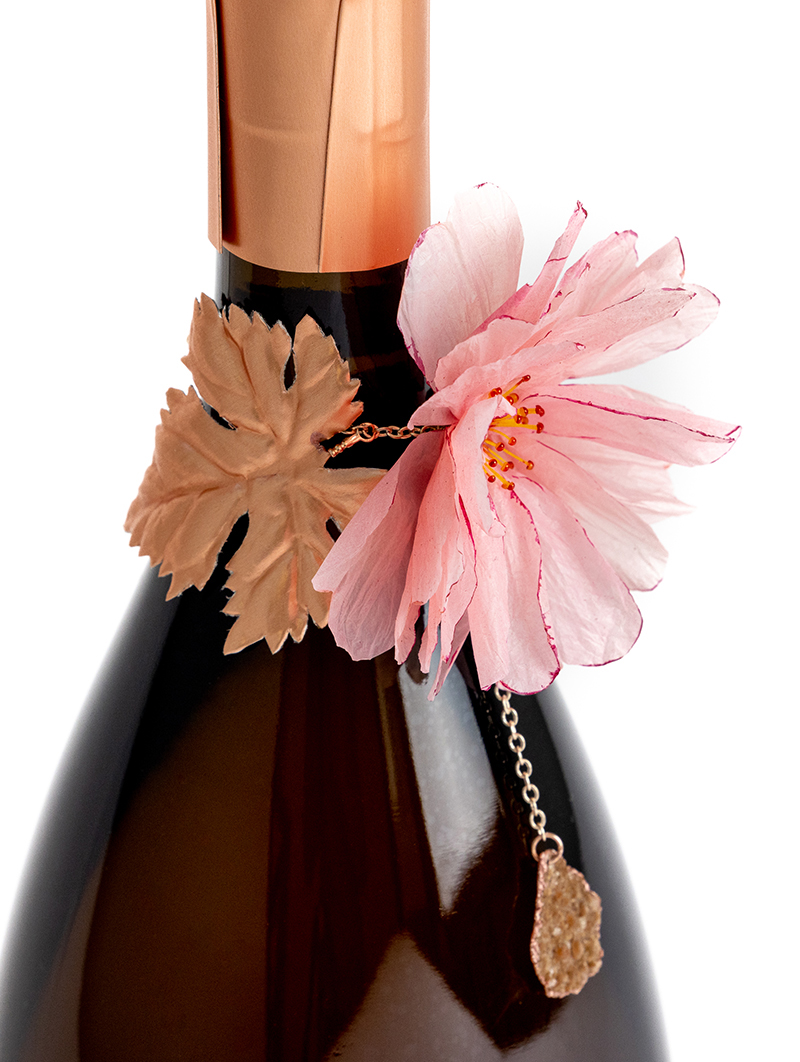 L’édition limitée RareChampagne par William Amor est une “Création Messagère” pour laquelle la terre, l’art et le futur se rencontrent pour former une Extra-Ordinaire Métamorphose. Une parure composée d’une «rosa péonie», de feuilles de vignes et d’un petit sequin viennent délicatement orner le flacon.