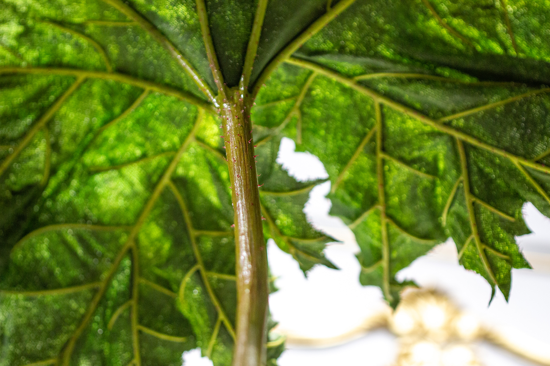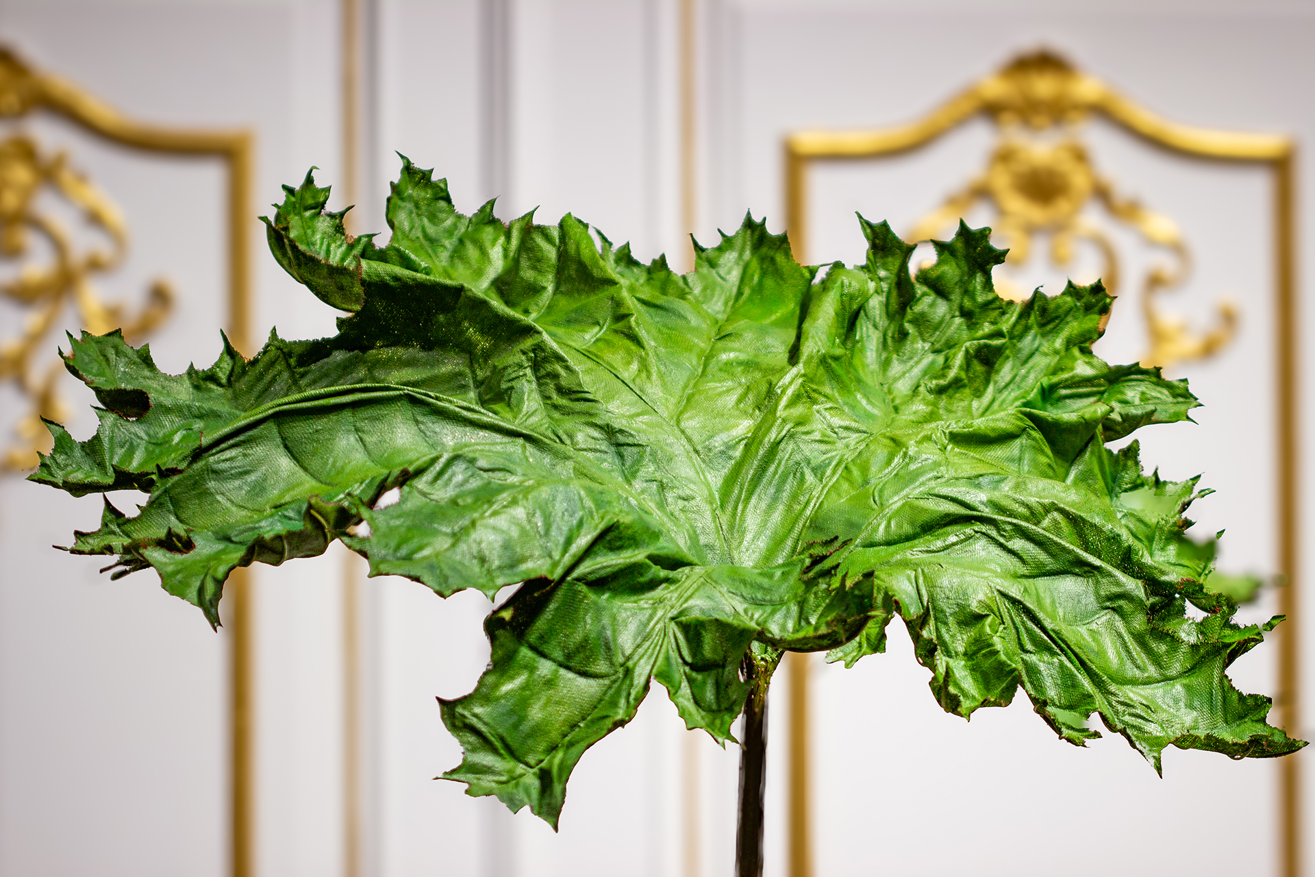 Ainsi recomposée, la feuille de Gunnera devient plus qu’une reproduction. Elle est une transmutation. Un objet de passage où le rebut devient précieux, où la mémoire industrielle et artisanale se fond dans un imaginaire végétal.